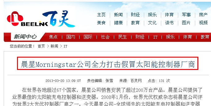 (中國網:晨星Morningstar公司全力打擊假冒太陽能控制器廠商 ) 中電日晟